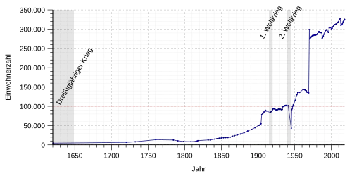 Die folgende Übersicht zeigt die Einwohnerzahlen nach dem jeweiligen Gebietsstand. Bis 1815 handelt es sich meist um Schätzungen, danach um Volkszählungsergebnisse (¹) oder amtliche Fortschreibungen der Stadtverwaltung (bis 1970) und des Statistischen Landesamtes (ab 1971). Die Angaben beziehen sich ab 1834 auf die „Zollabrechnungsbevölkerung“, ab 1871 auf die „Ortsanwesende Bevölkerung“, ab 1925 auf die Wohnbevölkerung und seit 1987 auf die „Bevölkerung am Ort der Hauptwohnung“. Vor 1871 wurde die Einwohnerzahl nach uneinheitlichen Erhebungsverfahren ermittelt.