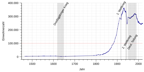 Der Rückgang der Einwohnerzahl während des Ersten Weltkriegs von etwa 320.000 Stadtbürgern im Jahr 1914 auf 278.000 Bewohner vier Jahre später wurde entgegen allen Prognosen schnell wieder ausgeglichen. Die Prognosen, die eine massive Abwanderung infolge der unzureichenden Ernährungslage vorhersagten, erfüllten sich nicht und so zählte man bereits 1919 wieder mehr als 300.000 Einwohner in der Stadt.