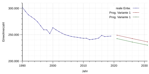 Prognosen der Stadt Chemnitz aus dem Juli 2016 ergaben, dass sich die Einwohnerzahl der Stadt Chemnitz beim derzeitigen Gebietsstand von 220,86 Quadratkilometer Stadtfläche bis zum Jahr 2030 zwischen 249.600 und 262.200 Einwohnern einpendeln wird.[9] Diese Schätzung sieht somit für die Zukunft einen geringen Zuwachs der Einwohnerzahl vor, im Gegensatz zu zurückliegenden Prognosen verschiedener Institutionen. Dies ist unter anderem damit zu erklären, dass Einwohnerrückgänge seit 2006 nur noch natürlichen Bevölkerungsbewegungen, also einem negativen Geburtensaldo, unterlagen. Die räumliche Wanderungsbewegung des Jahres 2006 umfasste mit mehr Zuzügen als Wegzügen einen positiven Wanderungssaldo zu Gunsten der Stadt Chemnitz. Die Bevölkerungszahl stieg 2010 leicht von 240 577 (2009) auf 240 809,[10] 2012 auf 241.705[11] und bis März 2019 auf 247.360 Einwohner an[12].