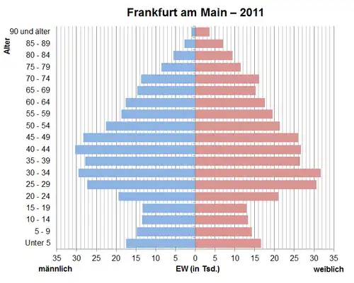 Bis 2003 lag das Durchschnittsalter der Frankfurter Bevölkerung immer über dem Bundesdurchschnitt, seitdem liegt es darunter. Von 1995 bis 2005 stieg das Durchschnittsalter in Frankfurt von 41,2 auf 41,9 Jahre, seitdem sank es bis 2017 kontinuierlich auf 40,6 Jahre.[31] Frankfurt hat das niedrigste Durchschnittsalter aller hessischen Gemeinden. Durch den anhaltenden Zuzug vorwiegend junger Menschen sinkt das Durchschnittsalter Frankfurts nach einer Studie des Instituts der deutschen Wirtschaft (IW) deutschlandweit am schnellsten.[31] Der Altersdurchschnitt in Hessen lag 2017 bei 43,7 Jahren, bundesweit bei 44,2 Jahren.[31]