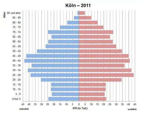 Am 31. Dezember 2016 betrug die „Amtliche Einwohnerzahl“ von Köln nach Fortschreibung des Landesbetriebes Information und Technik NRW 1.075.935 (nur Hauptwohnsitze und nach Abgleich mit den anderen Landesämtern).[1] Zum 31. Dezember 2021 lebten 1.079.301 Personen mit Haupt- und Nebenwohnsitz in Köln.[2] Köln ist seit 2010 wieder eine Millionenstadt, nachdem es 1975 durch Eingemeindungen für ein Jahr diese Grenze überschritt. Sie ist somit die vierte Millionenstadt in Deutschland. Zum 31. Dezember 2017 meldete das Amt für Stadtentwicklung und Statistik der Stadt Köln eine Einwohnerzahl von 1.084.795 Einwohnern.[3]