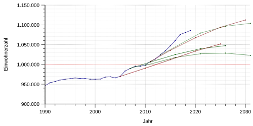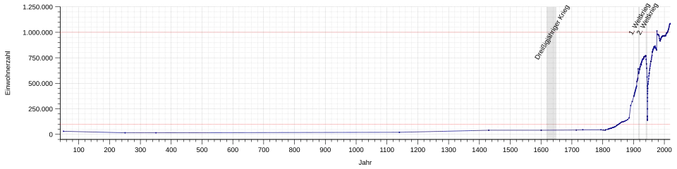 Die folgende Übersicht zeigt die Einwohnerzahlen nach dem jeweiligen Gebietsstand. Bis 1807 handelt es sich meistens um Schätzungen, danach um Volkszählungsergebnisse (¹) oder amtliche Fortschreibungen der Stadtverwaltung (bis 1970) und des Statistischen Landesamtes (ab 1971). Die Angaben beziehen sich ab 1834 auf die „Zollabrechnungsbevölkerung“, ab 1871 auf die „Ortsanwesende Bevölkerung“, ab 1925 auf die Wohnbevölkerung und seit 1987 auf die „Bevölkerung am Ort der Hauptwohnung“. Vor 1834 wurde die Einwohnerzahl nach uneinheitlichen Erhebungsverfahren ermittelt.