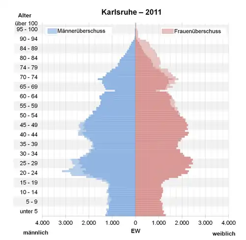 - ↑ Datenbank Zensus 2011, Karlsruhe, Alter + Geschlecht