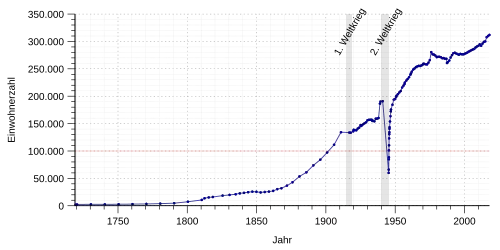Die folgende Übersicht zeigt die Einwohnerzahlen nach dem jeweiligen Gebietsstand. Bis 1830 handelt es sich meist um Schätzungen, danach um Volkszählungsergebnisse (¹) oder amtliche Fortschreibungen der Stadtverwaltung (bis 1970) und des Statistischen Landesamtes (ab 1971). Die Angaben beziehen sich ab 1837 auf die „Zollabrechnungsbevölkerung“, ab 1871 auf die „Ortsanwesende Bevölkerung“, ab 1925 auf die Wohnbevölkerung und seit 1987 auf die „Bevölkerung am Ort der Hauptwohnung“. Vor 1837 wurde die Einwohnerzahl nach uneinheitlichen Erhebungsverfahren ermittelt.