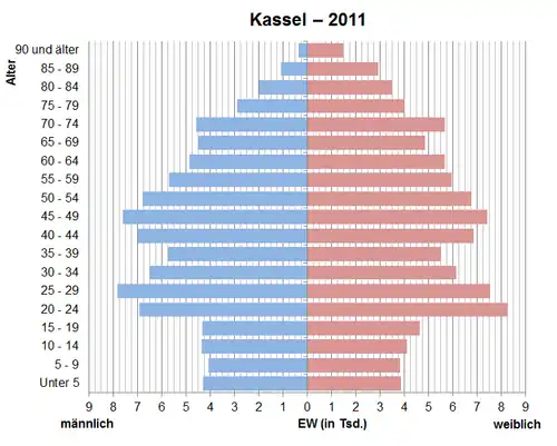 - ↑ Datenbank Zensus 2011, Kassel, Alter + Geschlecht