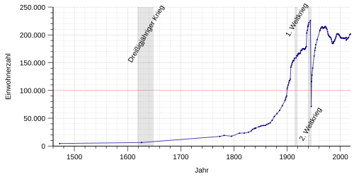 Nach Beendigung des Krieges stieg die Bevölkerung der Stadt durch die Rückkehr der Zwangsevakuierten und den Zustrom zahlreicher Flüchtlinge und Vertriebenen aus den ehemaligen deutschen Ostgebieten bis 1959 auf über 200.000 Personen. Dem Anstieg stehen die Ausweisung von Neubaugebieten durch Nachbargemeinden gegenüber, die zu einer Verschiebung zugunsten der Vororte führen. Von 1977 bis 1992 und von 1997 bis 2015 lag die Bevölkerungszahl knapp unter der Grenze von 200.000. Im Jahre 2019 stand die Stadt mit über 205.481 Einwohnern unter den deutschen Großstädten an 40., innerhalb Hessens an dritter Stelle.