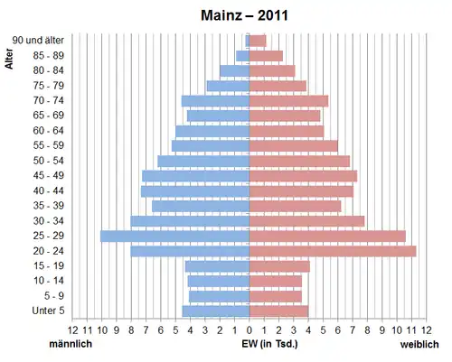 - ↑ Datenbank Zensus 2011, Mainz, Alter + Geschlecht