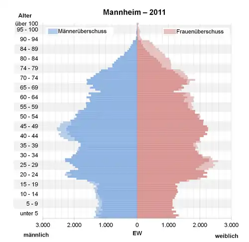 - ↑ Datenbank Zensus 2011, Mannheim, Alter + Geschlecht