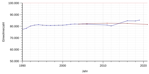 Die tatsächliche Einwohnerzahl im Dezember 2020 war um ca. 4.000 Einwohner größer als von der Bertelsmann Stiftung prognostiziert. Sie betrug zu dem Zeitpunkt bereits 85.686.