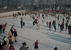 1957 wurde die moderne Kunsteisbahn errichtet, die bis zu ihrem Abriss bestand. Das Projekt verfasste Architekt Jakob Tabacznik[1] aus Winterthur. Es wurden zwei Eisfelder errichtet, eines mit einer Tribüne auf der Seite. Zudem wurden Garderoben, Kassenhäuschen, ein Kiosk und ein Betriebsgebäude errichtet. Die ganze Anlage kostete 1,8 Mio. Franken und wurde zu Teilen von je 600'000 Fr. von der Stadt Winterthur und der Sport-Toto-Gesellschaft und zu Teilen von je 300'000 Fr. von einer Aktiengesellschaft und durch Hypotheken bezahlt. Inoffiziell eröffnet wurde die fertige Eisbahn dann Anfangs November 1957. Das erste Spiel auf der neuen Kunsteisbahn war das Cupspiel des Erstligisten EHC Veltheim gegen den NLB-Club EHC Kleinhüningen (Veltheim unterlag 2:5) am 17. Dezember 1957, als offizielles Eröffnungsspiel im Rahmen einer Eröffnungsfeier diente jedoch ein Spiel des EHC Veltheim gegen den HC Lugano am 12. Januar des nächsten Jahres, das Veltheim vor 3'600 Zuschauern mit 1:4 ebenfalls verlor.[2] Die gemischtwirtschaftliche AG, die anfangs für die Eisbahn zuständig war, wurde relativ schnell aufgelöst, und der Besitz und Betrieb der Eisbahn ging zur Stadt Winterthur über. Infolge der Errichtung des neuen Stadions wurde das Stadion gleich dreimal Ausrichter der Schweizer Meisterschaften im Eiskunstlaufen: 1960, 1964 und 1970.