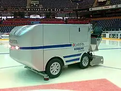 - Unter oder neben der Maschine befindet sich oft ein ausschwenkbarer und rotierender Besen, mit dem die Eisfläche im Bereich der Bande und der untere Teil der Bande selbst von losem Schnee und Eis befreit wird.