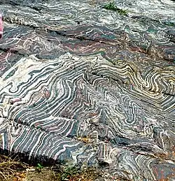 Große Eisenvorkommen sind Bändererze, eine Gesteinsart, die aus wiederholten dünnen Schichten von Eisenoxiden besteht, die sich mit Bändern aus eisenarmem Schiefer und Kieselgestein (Chert) abwechseln. Die Bändererze wurden hauptsächlich in der Zeit zwischen vor 3700 Millionen Jahren und vor 1800 Millionen Jahren abgelagert (die jüngsten entstanden vor 350 Millionen Jahren), und zwar durch Reaktion von Eisen mit dem durch cyanobakterielle Photosynthese entstehenden Sauerstoff.[92]