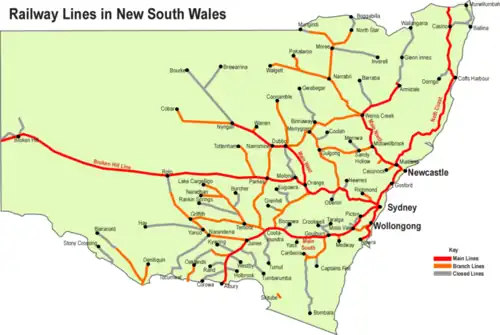 Mit dem Chefingenieur John Whitton wurde dann ab 1857 der Aufbau eines Eisenbahnnetzes für die Kolonie verfolgt. Goulburn im Südwesten von Sydney, Murrurundi im Norden und Bathurst im Westen wurden erreicht. Für Letzteres mussten die Blue Mountains überschritten werden, was an beiden Seiten des Gebirges jeweils extrem aufwändige Ingenieurbauten erforderte, jeweils eine Serie von Spitzkehren. Gebaut wurden sie 1867 und 1869 und 1910 durch tiefer liegende Tunnel ersetzt. Die westliche Spitzkehre ist museal als Zig Zag Railway erhalten. In einem für die UNESCO erstellten Gutachten wurde erwogen, dieses technische Kulturdenkmal in die Liste des Welterbes der Menschheit einzutragen[1]. 1883 wurde in Albury die Grenze und der Anschluss zum Netz der Kolonie Victoria erreicht. Wegen der unterschiedlichen Spurweiten war ein Durchfahren der Züge zunächst aber nicht möglich. Fahrgäste mussten umsteigen, Güter umgeladen werden. 1886 wurde Bourke erreicht. Die Strecke, die auf den Ort zuführte, war damals das längste gerade Stück Eisenbahnstrecke weltweit, in diesem Rekord erst abgelöst durch die 478 km lange Eisenbahngerade der Transaustralischen Eisenbahn, die 1917 in Betrieb genommen wurde. 1906 wurde Sydney Central Railway Station in Betrieb genommen. Der Bahnhof ist mit 27 Bahnsteiggleisen (25 davon werden betrieben) noch heute der größte Australiens. 1927 wurde mit Broken Hill der äußerste Westen des Staates und zugleich über eine 30 km lange schmalspurige, private Bahn, die Silverton Tramway, der Anschluss an die Eisenbahn von Südaustralien erreicht. Diese war hier allerdings in Schmalspur gebaut, so dass Reisende auch hier umsteigen und Güter umgeladen werden mussten. Zugleich war dies aber auch ein wichtiges künftiges Segment der heutigen Transaustralischen Eisenbahn. Von der Eisenbahn von New South Wales mitbetrieben wurde seit der Eröffnung 1914 auch immer die 8 km kurze Australian Capital Territory Railway nach Canberra, deren Infrastruktur im Eigentum des Australischen Bundes steht.