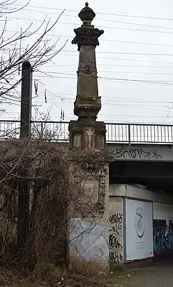 Die ursprüngliche historische Eisenbahnbrücke ist nicht erhalten und wurde Anfang des 21. Jahrhunderts durch einen modernen Neubau ersetzt. Erhalten blieben jedoch vier an den Seiten befindliche Obeliske aus Sandstein, die in den Brückenneubau integriert wurden. Die reich im Stil des Neobarock verzierten Obelisken, waren in der Zeit um 1900 im Zusammenhang mit dem Bau einer heute jedoch nicht mehr vorhandenen, zum Bahnhof Magdeburg-Neustadt führenden Treppenanlage errichtet worden.