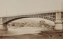 Die erste Eisenbahnbrücke an dieser Stelle entstand aufgrund einer Lizenz, die der Bahngesellschaft Compagnie des chemins de fer de Paris à Lyon et à la Méditerranée (PLM) erteilt worden war. Erbaut wurde sie von dem später als Fives-Lille firmierenden Unternehmen. Das 284 m lange und 7 m breite Bauwerk bestand aus fünf Segmentbogen mit Stützweiten von 55 m, die sich auf massiven Mauerwerkspfeilern abstützten. Entsprechend einer damals in Frankreich verbreiteten Bauweise bestand jeder der großen Bögen aus vier parallelen gusseisernen Bogenträgern, die ihrerseits aus einer Reihe von miteinander verschraubten Einzelstücken bestanden. Die Bogenzwickel waren durch zwei Reihen gusseiserner Formteile zur Aufständerung des Fahrbahnträgers ausgefüllt. Die Bogenträger waren durch eiserne Traversen in den Zwischenräumen versteift.[1] Die Gründung der Pfeiler durch Senkkästen ähnelte dem zuvor bei der Rheinbrücke Kehl erprobten Verfahren.[2]
