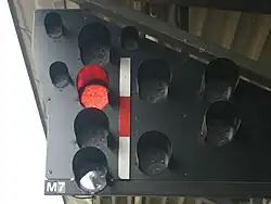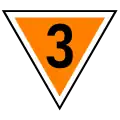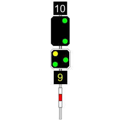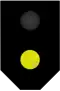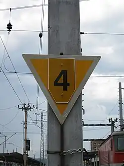 | Ankündigungssignal | Eine schwarze Kennziffer auf einer auf der Spitze stehenden dreieckigen rückstrahlenden gelben Tafel mit weißem Rand. Bei beschränkten Raumverhältnissen kann die Dreieckspitze nach oben zeigen. |