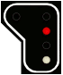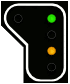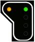 • Schwarzer dreieckiger Signalschirm mit zwei diagonal übereinander angeordneten weißen Lichtern: Vorbeifahrt für kleine Bewegungen erlaubt.