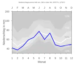 Der durchschnittliche Jahresniederschlag der Jahre 1961 bis 1990 beträgt an der Messstation Eisenberg 646 mm und liegt damit außer in den Monaten April und August unter dem deutschen Durchschnitt. Der trockenste Monat ist der Februar, die meisten Niederschläge fallen im Juni und August.