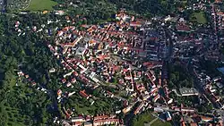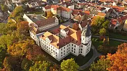 Nachweislich gehen die Wurzeln der Stadt bis in die Steinzeit zurück. Die älteste bekannte Ansiedlung befand sich im Norden des heutigen Stadtgebietes. Diese wurde vermutlich im 14. oder 15. Jahrhundert aufgegeben. Unterschiedlichen Angaben zufolge wanderten die Bewohner ins heutige Polen aus oder zogen aufgrund der Zerstörungen im Sächsischen Bruderkrieg in die im 12. Jahrhundert entstandene neue Stadt nahe der Burg.[3] Selbige war ein Vorgängerbau des jetzigen Schlosses. Sie wurde im 12. Jahrhundert im Auftrag des Markgrafen von Meißen errichtet. Im 16. Jahrhundert wurde sie umgebaut, 1677–1692 dann unter Herzog Christian von Sachsen-Eisenberg zum heute noch erhaltenen und nach ihm benannten Schloss Christiansburg ausgebaut.[4]