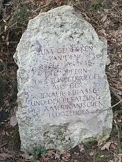 Am 9. Februar 1945 kollidierten im Raum zwischen Jena und Eisenberg zwei Bomber der United States Army Air Forces vom Typ Boeing B-17 „Flying Fortress“, nachdem einer von ihnen durch Flak beschädigt worden war. Dem anderen war beim Zusammenstoß das Heck abgerissen worden, er stürzte im Eisenberger Mühltal ab, 50 Meter nördlich der Pfarrmühle. Acht Besatzungsmitglieder kamen ums Leben, der Heckschütze konnte sich retten. Vor dem Absturz entledigte sich die Maschine noch ihrer Bomben über Eisenberg. Diese explodierten zwar nicht, zerstörten dennoch zwei Häuser, beschädigten weitere und töteten zehn Menschen.[13]