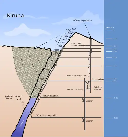 Die Sohlen der Erzgrube Kiruna sind nach der Höhe in Bezug auf die heutige Spitze des Kiirunavaaras benannt. Die Bergspitze trägt die Bezeichnung 0 m, der Schachtkopf der Aufzuganlage befindet sich auf dem Niveau −142 m, der Eingang zur Grube auf dem Niveau −230 m. Der Kiirunavaara war ursprünglich höher; die ehemalige Bergspitze bestand aus Eisenerz und wurde 1910 abgebaut. Mit den Jahren wurde der Abstand zwischen den Hauptsohlen immer größer.[5][21] Die Hauptsohlen des Bergwerks befinden sich bei −275 m, −320 m, −420 m, −540 m, −775 m, −1045 m und −1365 m.[26]