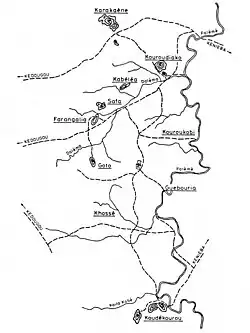 Zwischen 1962 und 1972 wurde hauptsächlich durch das Bureau de recherches géologiques et minières (BRGM) eine Reihe neuer Untersuchungen im Gebiet von Falémé abgewickelt. Sie waren primär auf Sulfiderze ausgerichtet und umfassten hauptsächlich Luft- und Bodengeophysik, Kernbohrungen und geologische Interpretationen der Gebiete von Kouroudiako,[1] Karakaene[2] und Koudekourou.[3] Die Arbeitsgemeinschaft BRGM-Krupp hat sich 1974 mit ersten Überlegungen, Aufbereitungsversuchen und Planungsentwürfen für ein 10-Mio.-t-Pellet-Projekt beschäftigt. Für eine phasenweise Exploration der Eisenerzvorkommen konstituierte sich im Februar 1975 die Société des Mines de Fer du Senegal Oriental (MIFERSO) mit der Republik Senegal, den Firmen Kanematsu Gosho, SEREM und Krupp als Partner. Die Explorationsarbeiten wurden 1975 aufgenommen und 1980 abgeschlossen.