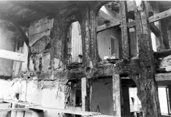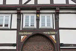An der rechten Traufseite haben sich Reste des bauzeitlichen Ständerfachwerkes mit Schwertungen erhalten.