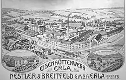 Am 7. August 1650 verkaufte die Witwe Rosina Rüdiger das überschuldete Hammerwerk an den Schwarzenberger Stadtrichter Friedrich Röhling und ihren Sohn Hans Rüdiger. Kaum nach den Zerstörungen im Dreißigjährigen Krieg wiedererrichtet, zerstörte im August 1661 eine große Flut die Hammerwerksanlagen erneut. 1806 kaufte der aus Obermittweida stammende Bergkommissionsrat Karl Heinrich Nitzsche den Hammer von den Gebrüdern Reinhold. Er beschäftigte in zwei Werken Hammerschmiede, Hammerbuben und Zimmerleute sowie Köhler. 1836 gelangte das Hammerwerk in den Besitz von Carl Gotthilf Nestler aus Wittigsthal und seinem Schwiegersohn Eduard Wilhelm Breitfeld aus Rothenhammer-Unterwiesenthal. Die Firma Nestler & Breitfeld, die auch den Siegelhof in Pöhla und den Arnoldshammer in Rittersgrün besaß, vergrößerte damit ihren Besitz und führte auch das Hammerwerk in Erla zu einem Aufschwung. Um 1840 wurde der Betrieb um ein Blechwalzwerk erweitert und neueste Verfahren zur Eisengewinnung kamen zum Einsatz. Nestler & Breitfeld ließen bis 1843 eine Maschinenbauanstalt angliedern, dessen Leitung der Engländer John Payne übernahm. Ab 1850 entstanden weitere Gebäude und verschlissene Anlagen mussten erneuert werden. Vor einem großen Brand im Jahr 1870 bestand der Erlaer Hammer aus 27 Einzelgebäuden, von denen durch das Feuer viele vernichtet wurden. Bis 1879 wurden die wichtigsten Teile des Eisenwerks wieder aufgebaut, auch Wohnhäuser entstanden neu. Allerdings gingen die Hochöfen nicht mehr in Betrieb, das Roheisen für die Eisenwarenproduktion wurde fortan aus Westfalen und Schlesien bezogen. Die Erzeugnisse aus den Fabriken in Erla waren nun Eisen- und Stahlguss, Maschinen, Haushaltsgeschirr und Schwarzbleche.[2] Der Bau der Bahnstrecke Johanngeorgenstadt–Schwarzenberg der Königlich Sächsischen Staatseisenbahnen 1883 (Haltestelle Erla) ermöglichte die verbesserte Rohstoffanlieferung und Versendung der Produkte. Die Fabrikanten hatten sich nun auf Maschinen für die Papierindustrie spezialisiert. An ihrer Spitze stand die Nestler & Breitfeld GmbH. Diese wurde später in eine Aktiengesellschaft umgewandelt, deren Aktienmehrheit 1928 von Jørgen Skafte Rasmussen, Inhaber der Zschopauer Motorenwerke (DKW), übernommen wurde. Während der Weltwirtschaftskrise und bei einem Hochwasser 1931 kam die Eisenproduktion zum Stillstand. Bei Nestler & Breitfeld, die Teile für DKW-Motoren produzierte, sollten ab 1933 die von Franz Xaver Mehr konstruierten „DKW Erla“-Kleinflugzeuge gebaut werden. Zu dem Zweck wurde am 16. September 1933 die „Eisen- und Flugzeugwerk Erla G.m.b.H.“ in das Handelsregister des Amtsgerichts Schwarzenberg/Erzgeb. eingetragen.