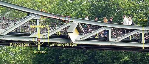 Je zwei der bisherigen vier Brückenabschnitte mutierten zu je zwei äußeren Fachwerkträgern, die über die Flusspfeiler in den Strom hinausragen (auskragen). Zwischen ihren Enden besteht eine Lücke, die von einem an seinen Enden aufgelegten, etwa 25 Meter langen Träger (Einhängeträger, mit je sechs seitlichen mit je einem Diagonalstab versehenen Fachwerk-Feldern) geschlossen wird. Die Pfeiler im Fluss wurden mit Stahlbetonquadern erhöht, und die beiden Haupt-Brückenteile wurden auf ihnen gelagert. Die funktionslos gewordenen Pylone verschwanden. Zum Ausgleich des Gewichts der Auskragungen und des Einhängeträgers wurden Gegengewichte aus Beton an den uferseitigen Enden der Hauptträger angebracht. Der nördliche Hauptträger ist auf seinem Pfeiler fest und am Ufer horizontal verschieblich gelagert. Der südliche Hauptträger ist an beiden Stellen beweglich gelagert. Die Verbindungen mit dem Einhängeträger sind drehbeweglich. Dehnfugen im Gehwegbelag zeigen die Verbindungsstellen an. Nahe dieser Stellen sind auch die Obergurte unterbrochen. Vier kurze Stücke der Obergurte haben keine tragende Funktion (siehe Markierung in rot in nebenstehender Abbildung). Sie sind nur wegen des Fortbestehens des alten Erscheinungsbildes nicht weggelassen worden.