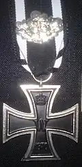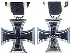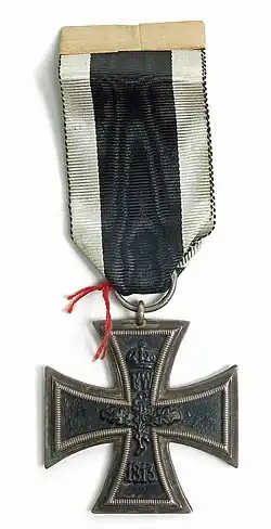 Das Eiserne Kreuz (EK) war eine ursprünglich preußische, später deutsche Kriegsauszeichnung, die vom preußischen König Friedrich Wilhelm III. am 10. März 1813 in Breslau für den Verlauf der Befreiungskriege in drei Klassen gestiftet wurde: Großkreuz, Eisernes Kreuz erster und zweiter Klasse. Das Eiserne Kreuz erster Klasse konnte nur Inhabern des Eisernen Kreuzes zweiter Klasse verliehen werden.[1] Das erste Eiserne Kreuz verlieh Friedrich Wilhelm III. postum seiner Gemahlin Luise.