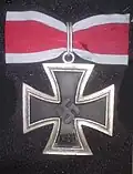 Das Ritterkreuz, 1939 gestiftet, wurde an einem breiten Band um den Hals getragen (das Ordensstatut sah vor, dass der Orden auf dem flachgebundenen Krawattenknoten liegen muss) und übernahm faktisch die Rolle des bis 1918 verliehenen preußischen Pour le Mérite, der nur an Offiziere vergeben wurde (für Mannschaften und Unteroffiziere wurde bis 1918 das Goldene Militär-Verdienst-Kreuz vergeben). Im Verlauf des Krieges traten als Steigerung der Auszeichnung bei weiteren Verdiensten nacheinander Eichenlaub (816 Verleihungen), Schwerter (157 Verleihungen) und Brillanten (27 Verleihungen) zum RK hinzu, die auf dem Tragering des Ordensbandes angebracht wurden. Als weitere Steigerung, die nur ein einziges Mal verliehen wurde, erhielt am 1. Januar 1945 der Stuka-Pilot Hans-Ulrich Rudel das Ritterkreuz des Eisernen Kreuzes mit goldenem Eichenlaub, Schwertern und Brillanten. Die letzte Steigerung war das Großkreuz. Dieser Orden wurde in der Zeit von 1939 bis 1945 ebenfalls nur einmal verliehen, an Hermann Göring, Oberbefehlshaber der Luftwaffe und Reichsmarschall.[16]