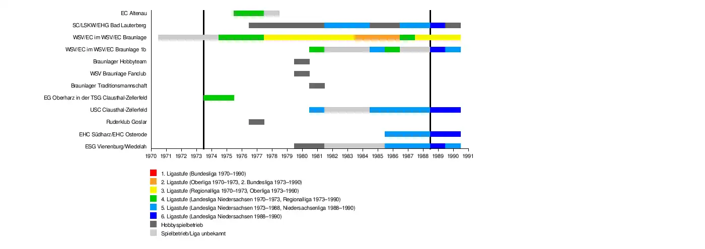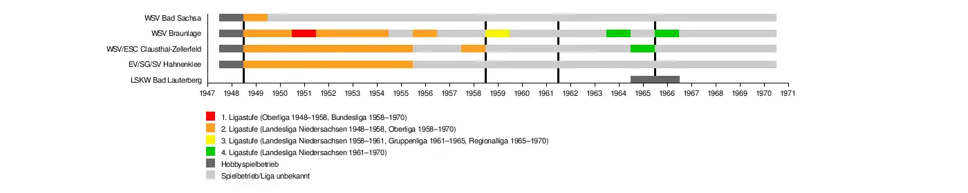 Mit der Einführung der Eishockey-Bundesliga ab 1958 wurde die Oberliga zur zweithöchsten Spielklasse, die Landesliga Niedersachsen wurde darunter somit nur noch die dritthöchste Spielklasse im deutschen Eishockey-Ligensystem.[62] Zur Saison 1961/62 wurde die Gruppenliga als dritthöchste Spielklasse unter der Bundesliga und der Oberliga eingeführt. Somit war die Landesliga Niedersachsen nun die vierthöchste Spielklasse. Ab der Saison 1965/66 trat die Regionalliga an die Stelle der Gruppenliga als dritthöchste Spielklasse. In der nachfolgenden Übersicht sind die Teilnahmen der Eishockeyteams aus dem Westharz am Spielbetrieb im Zeitraum 1948–1970 dargestellt. Sofern anhand einschlägiger Quellen bekannt, ist die jeweilige Liga-Ebene farblich dargestellt. Wo keine gesicherten Quellen vorliegen erfolgte eine graue Einfärbung.