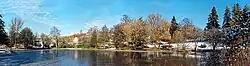 Im benachbarten Braunlage hatten die Winterfeste bereits eine etwas längere Tradition, wenngleich der Eissport zunächst keine Rolle spielte. Von 1908 bis 1909 wurde auf einem Wiesengelände im Bereich des heutigen Kurparks der Gondelteich angelegt, auf dem im Winter Schlittschuh gelaufen, Eishockey gespielt und Eisstockschießen betrieben wurde.[16] Berliner Eislaufvereine führten ab dem Jahr 1909 „Kunst- und Schnellauf-Konkurrenzen“ durch.[A 1] In den Jahren 1911 bis 1913 erfolgte die Anlage einer Eisbahn durch die Gemeinde Braunlage.[17]