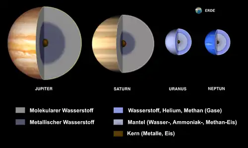 Zwar besitzen auch Eisriesen Wasserstoffhüllen, diese sind jedoch viel kleiner und machen nicht den Großteil des Planeten aus. Allerdings erschweren die Wasserstoffhüllen die Beobachtung des Inneren der Eisriesen, und daher ist das bisherige Wissen um deren Zusammensetzung und Entwicklung begrenzt.[3]