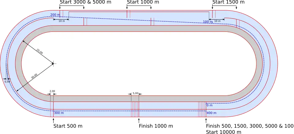 Nach den Regeln der Deutschen Eisschnelllauf-Gemeinschaft[7] sind ovale Laufbahnen mit entweder 400 Meter oder 333,33 Meter Laufbahnlänge zulässig. Bei Wettbewerben der ISU sind 400 Meter Bahnlänge vorgeschrieben. Die Kurven sollen einen inneren Radius von 25 bis 26 Meter haben, die Bahnbreite zwischen vier und fünf Meter betragen. Die reguläre Wettkampfbahn ist damit eine 400 Meter umfassende, ovale Bahn, auf der zwei Wettkampf-Laufspuren von je fünf Meter Breite und zuinnerst eine Warmlaufbahn abgeteilt sind. Der Kurvenradius ist 25 Meter auf der Innenlinie der Innenbahn und 30 Meter auf der Trennlinie zwischen den beiden Wettkampflaufspuren, die Geraden sind je etwa 110 Meter lang.