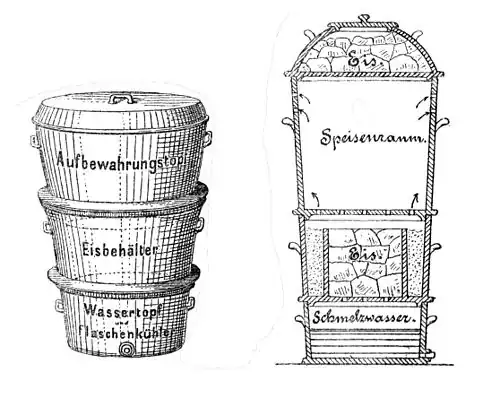 Der obere zur Aufbewahrung von Speisen und Getränken dienende Speisenraum hatte einen Siebboden, d. h. der glasierte Tonboden war mit Löchern versehen, um die Lebensmittel möglichst nahe der Temperatur des Eises auszusetzen, aber nicht direkt mit ihm in Kontakt zu bringen. Aus hygienischen Gründen wurde der Kontakt mit dem oft verunreinigten Natureis vermieden.