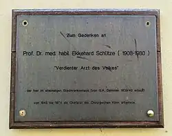 Anlässlich seines 100. Geburtstages ehrte das Klinikum Schwerin Schütze als „Urvater des Schweriner Gesundheitswesens“ mit einer Gedenktafel im ehemaligen Bezirkskrankenhaus, das nach der Wende und friedlichen Revolution in der DDR zuletzt als Orthopädische Klinik gedient hatte.