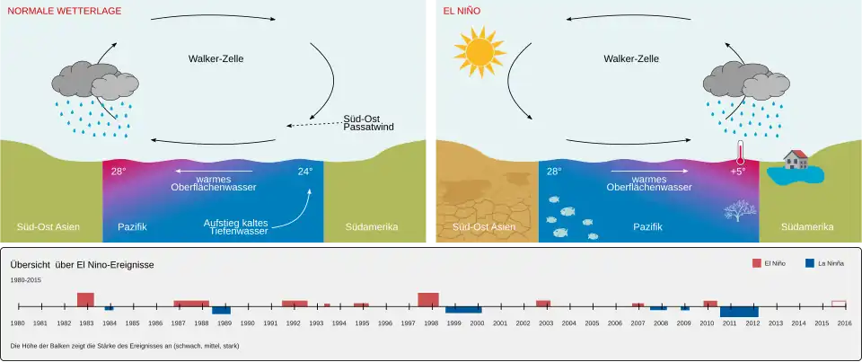 Der Ostpazifik vor Südamerika erwärmt sich, während vor Australien und Indonesien die Wassertemperatur absinkt. Aufgrund der im Normalfall erhöhten Temperatur im Westpazifik kommt es zu einer Luftdruckabnahme und im kälteren Ostpazifik zur Bildung eines Hochdruckgebiets. Dadurch entstehen bodennahe Ostwinde, die warmes Oberflächenwasser aus dem Pazifik vor Südamerika in Richtung Westen nach Indonesien schieben. Während eines El Niños wird diese Luftzirkulation, genannt „Walker-Zirkulation“, umgekehrt. Dabei strömt während eines Zeitraums von etwa drei Monaten das warme Oberflächenwasser von Südostasien nach Südamerika.