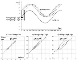 Bei der folgenden Betrachtung soll dieser Verzögerungseffekt an idealisierten Preis-Zeitreihen in Form von Sinuswellen demonstriert werden. Sie haben den Vorteil, dass sie ausschließlich systematische Zeitreihenkomponenten enthalten, also frei von stochastischen Einflüssen sind. Daneben lassen sie sich mit nur wenigen Parametern darstellen. Der Marktpreis wird derart als Sinuskurve dargestellt, dass Preissteigerungen sowie -senkungen durchlaufen werden. Die Zeitreihe des Produktpreises wird mit exakt der gleichen Sinusfunktion realisiert (gleiche Amplitude), allerdings wird diese um zwei bzw. vier Tage auf der x-Achse in die Zukunft verschoben, um die Verzögerung bei der Preisanpassung zu simulieren (s. Abb. 3).