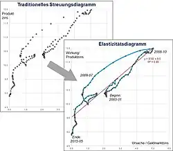 Durch die Punktwolke wird bei der Regressionsanalyse nach dem Verfahren der Kleinsten-Quadrate-Methode eine Gerade gelegt, deren Steigung der gesuchten Elastizität entspricht. Das Elastizitätsdiagramm unterscheidet sich vom „traditionellen“ Streuungs- bzw. Punktdiagramm letztendlich allein dadurch, dass die Kombinationspunkte der jeweils folgenden Zeitpunkte durch Linien miteinander verbunden werden.[6] Die originäre Zeitreihe wird somit in keiner Weise geändert oder verfälscht.