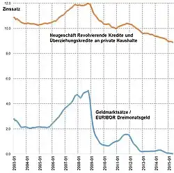 Die Analyse kausaler Abhängigkeiten mit Hilfe von Elastizitäten soll an einem Beispiel demonstriert werden. Für diese Inanspruchnahme des Kreditrahmens bei einem Girokonto stellt die Bank Zinsen in Rechnung, deren Höhe von den kurzfristigen Zinssätzen (also Zinssätzen mit einer täglich neu festlegbaren Zinsbindung) an den Geld- und Kapitalmärkten abhängt (vgl. Revolvierender Kredit). Es existiert also ein Kausalzusammenhang zwischen der Zinsentwicklung an den Finanzmärkten und den Zinssätzen, den die Banken bei ihren Kunden ansetzen. In der Abbildung sind die Zinssätze für Überziehungskredite und dem Geldmarktzins EURIBOR seit 2003 dargestellt.