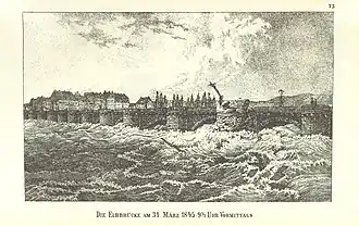 „Das Getöse der an den Eisbrechern und Bogengewölbesteinen zerschellenden Häuser, Flöße und Gerüste, deren Langholz wie Tonpfeifenröhren zerbrachen, war fürchterlich und erfüllte die Bewohner der Elbufer mit immer größerem Graus.“[10]