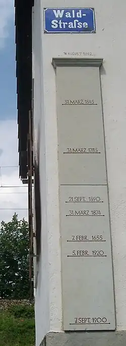 Die Pegelmaxima können von Ort zu Ort stark voneinander abweichen und hängen unmittelbar von lokalen Abflusshindernissen ab, zum Beispiel von Brücken, Aufschüttungen oder Gebäuden.[16] In Bad Schandau in der Sächsischen Schweiz kamen nach 1845 weitere Häuser zum Ortsbild hinzu, die zu Stauungen führten. Der Pegelstand übertraf hier 2002 den alten Rekord. Auf der anderen Elbseite, im Schandauer Ortsteil Krippen, wurde 2002 der Pegel von 1845 nicht erreicht, da hier kaum nennenswerte Gebäude in Ufernähe hinzugekommen waren. Während in Sachsen-Anhalt in Riesigk und Schönebeck noch immer das Hochwasser von 1845 den historischen Höchststand markiert, wurde er im dazwischen liegenden Roßlau 2002 deutlich übertroffen.