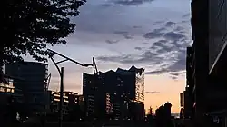 Die Elbphilharmonie (umgangssprachlich Elphi)[2][3] ist ein im November 2016 fertiggestelltes Konzerthaus in Hamburg. Sie wurde mit dem Ziel geplant, ein neues Wahrzeichen der Stadt und ein „Kulturdenkmal für alle“ zu schaffen.[4][5][6] Das 110 Meter hohe Gebäude im Stadtteil HafenCity liegt am rechten Ufer der Norderelbe an der Spitze des Großen Grasbrooks zwischen den Mündungen der Hafenbecken Sandtorhafen und Grasbrookhafen. Es wurde unter Einbeziehung der Hülle des früheren Kaispeichers A (Baujahr 1963) errichtet. Auf diesen Sockel wurde ein moderner Aufbau mit einer Glasfassade gesetzt, die an Segel, Wasserwellen, Eisberge oder einen Quarzkristall erinnern soll. Die Lage am Kaiserhöft ist von der einstigen industriellen Hafennutzung und der neugotischen Backsteinarchitektur der Speicherstadt geprägt. Die Elbphilharmonie ist das höchste bewohnte Gebäude Hamburgs.[7]