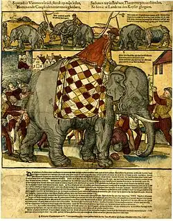- ↑ Caspar Horn: Elephas. Das ist Historischer und Philosophischer Diskurs/ von dem großen Wunderthier dem Elephanten/ Dessen wunderbarer Natur vnnd Eygenschafften; dergleichen vnlängsten einer in Teutschland umbgeführet/ und von vielen Tausend Menschen gesehen worden. Auß bewehrten alten und newen Historien zusammen getragen und verfasset durch Caspar Hornium Phil & Med Doctorem. Simon Waldmayer, Nürnberg 1629 (Digitalisat; S. 65)