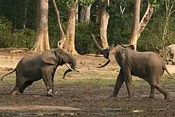 Elefantenbullen erleben periodisch eine sexuelle Verhaltensänderung, deren Dauer stark variieren kann und die als Musth bezeichnet wird. Die Musth setzt im Unterschied zur Brunft zahlreicher Huftiere nicht synchron ein, sondern verläuft individuell, so dass in intakten Populationen zu jedem Zeitpunkt des Jahres wenigstens ein fortpflanzungsbereiter Bulle vorkommt. Die Asynchronität reduziert wiederum die energetischen Kosten bei Dominanzkämpfen und Rivalität. Besondere Kennzeichen der Musth finden sich in der erhöhten Aggressivität der männlichen Tiere. Dadurch können Bullen in der Musth auch physisch stärkere Individuen dominieren. Äußerlich markiert ein erhöhter Sekretausfluss an den Temporaldrüsen den Musth-Status. Einher geht die Musth mit einem extremen Anstieg des Testosteronspiegels, dabei kann die Hormonkonzentration um bis zu das 100fache gegenüber den Werten außerhalb der Musth-Phase zunehmen.[112][113][114] Bullen wandern während der Musth verstärkt umher und suchen verschiedene Herden auf, wo sie die Geschlechtsteile und andere Körperpartien der Kühe nach paarungsbereiten Individuen kontrollieren. Dabei signalisiert der Bulle selbst durch Abtasten oder Ringkämpfe mit dem Rüssel und Nackenbisse sein eigenes Interesse. Größere Aufmerksamkeit erlangen bei ihm weibliche Tiere im mittleren Abschnitt der Brunft. Beim Geschlechtsakt ist er auf die Mitarbeit der Kuh angewiesen, da sein S-förmig gewundener Penis nur bei Stillstand in die Vulva eingeführt werden kann.[64][1]