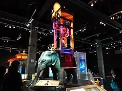 Durch die Drehbewegung der Schlange wird die versunkene Schüssel wieder aus dem Wasser gezogen und geleert. Danach fällt die Kugel in eine Vase und der am Kopf des Elefanten sitzende Mahut schlägt auf ein Becken. Daraufhin schwingt die Schlange zurück und der Vorgang wiederholt sich, solange noch Bälle in dem Korb vorhanden sind. Dieser muss zweimal am Tag wieder gefüllt werden.[2]