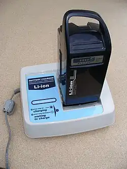 Aktuell werden die besonders leichten Li-Ion-Akkus von den meisten Herstellern eingesetzt. Sie können einige Hundert Male aufgeladen werden (vollständige Ladezyklen gezählt). Bei Kurzschluss und Überhitzung der Zellen können heftige chemische Reaktionen ausgelöst werden. Diese Gefahren sollen durch modernes Batteriemanagement ausgeschlossen werden; Brände seien vergleichsweise selten.[19][20] Li-Ionen-Akkus liefern bei geringen Temperaturen deutlich weniger Leistung und vertragen meist keinen Frost.