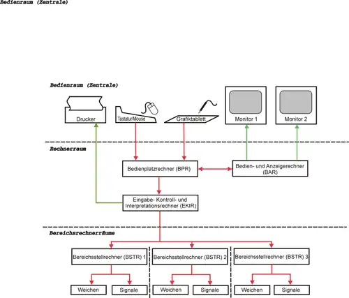 - Bedienraum in der Zentrale als Schnittstelle zum Bediener mit den Sichtgeräten (Monitore) und den Eingabegeräten (Grafiktablett mit Elektroniktaster, PC-Tastatur, Maus).