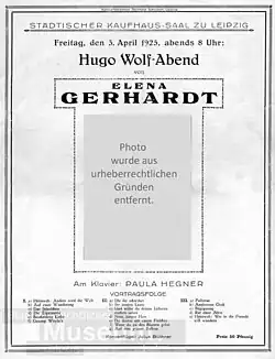 Elena Gerhardt (* 11. November 1883 in Connewitz; † 11. Januar 1961 in London) war eine deutsche Opernsängerin (Mezzosopran), die 1934 zur Emigration gezwungen wurde. Sie war eine der bedeutendsten Lied-Interpretinnen der ersten Hälfte des 20. Jahrhunderts.